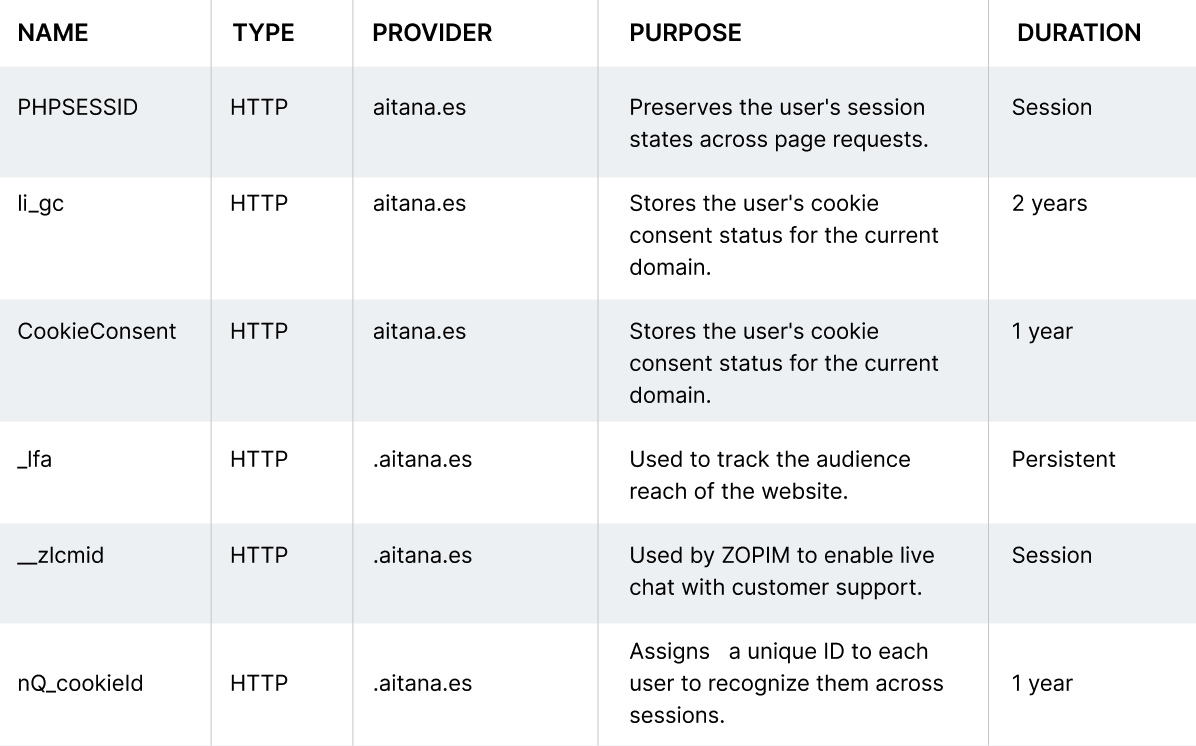 If you have any questions about this cookie policy, you can contact AITANA MANAGEMENT, S.L. via the following email: mkt@aitana.es.