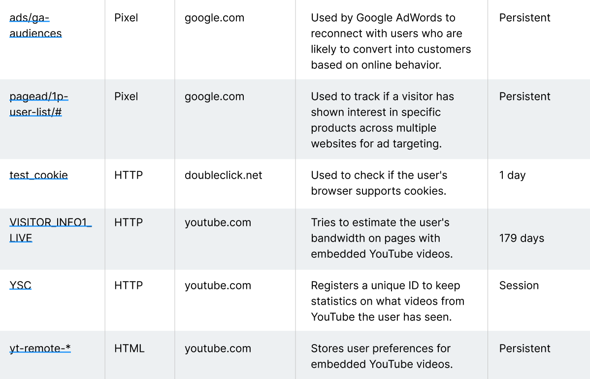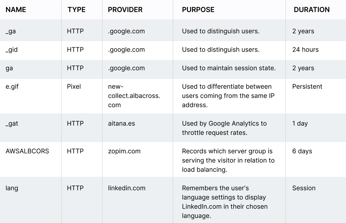 Here is a list of third-party cookies we use: